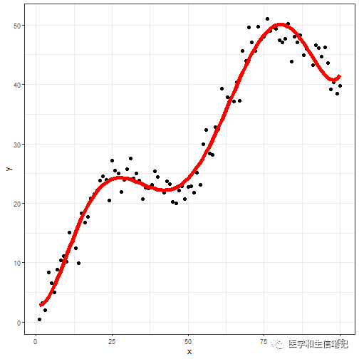 可以看到拟合线比较贴合数据。但是在拟合线的开头和末尾可以发现有点上翘的趋势,这也是多项式拟合的缺点,如果此时在两头多点数据,可能拟合效果就不是很好了。解决方法也很简单,就是我们下次要介绍的样条回归。