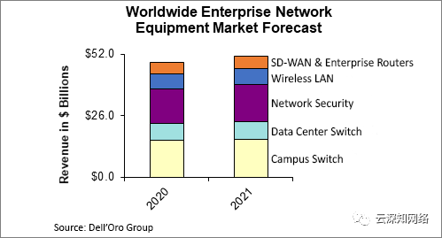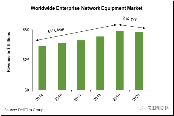 Dell’Oro Group报告显示,由于疫情的影响,2020年全年的企业网络设备市场整体同比(Y/Y)下降了2%,达到4850亿美元。这一数据远远背离2014年至2019年实现的6%的年均增长率。