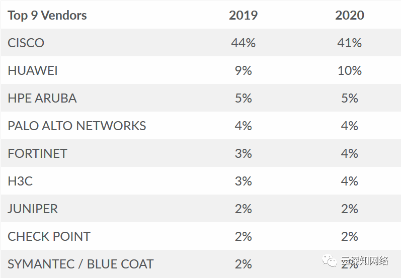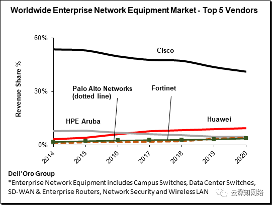 从供应商的角度看,华为和思科在2020年占据了约50%的企业网络设备市场份额;它们是企业网络设备市场中仅有的两家收入份额超过10%的供应商。