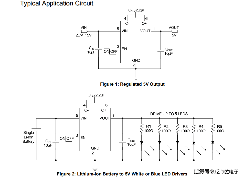 本电路采用新的电荷泵架构,保证零负载情况下工作在恒定的开关频率,并同时减少输入和输出纹波。该电路具有热保护功能,能承受从VOUT到GND的持续短路。内置的软启动电路能防止启动时产生过大的浪涌电流。较高的开关频率,可以使用小型的陶瓷电容。低电流待机电流,小于1uA