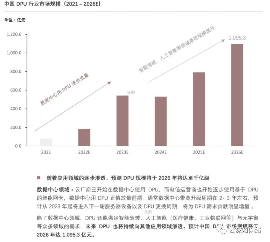当然,强中更有强中手,莫向国人夸大口。下面是来自国内机构头豹的中国DPU行业市场规模数据,赶英超美跑步进入共产主义。