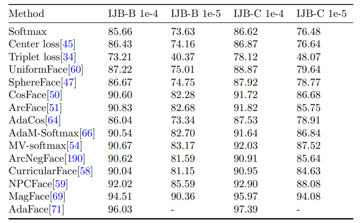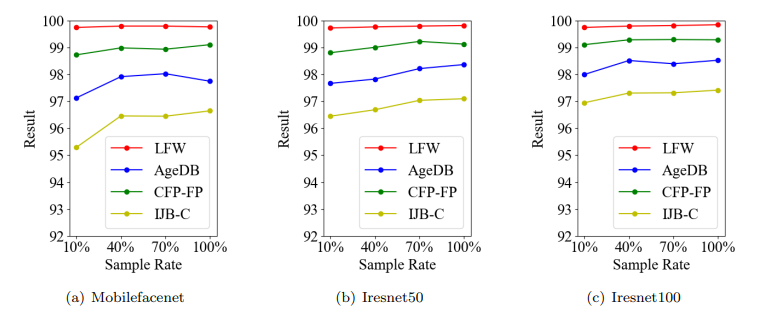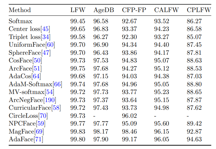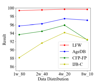 LFW、AgeDB、CFP-FP和IJB-C的结果。N S意味着相应的数据集有N个身份,每个身份有S个样本。
