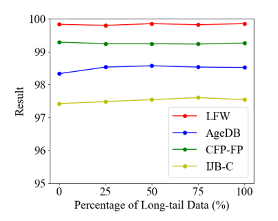 不同比例的长尾数据在LFW、AgeDB、CFP-FP和IJB-C上的结果