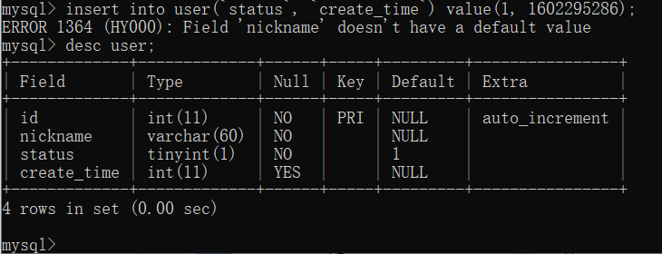 CREATE TABLE `user` ( `id` int(11) NOT NULL AUTO_INCREMENT COMMENT '用户ID,主键且自增', `nickname` varchar(60) NOT NULL COMMENT '用户昵称', `status` tinyint(1) NOT NULL DEFAULT '1' COMMENT '状态 0 关闭 1 开启 默认为 1', `create_time` int(11) DEFAULT NULL COMMENT '注册时间', PRIMARY KEY (`id`)) ENGINE=InnoDB DEFAULT CHARSET=utf8 COMMENT='用户表';没有默认值的字段必须给值:nickname 字段设置了 not null 且没有设置 default