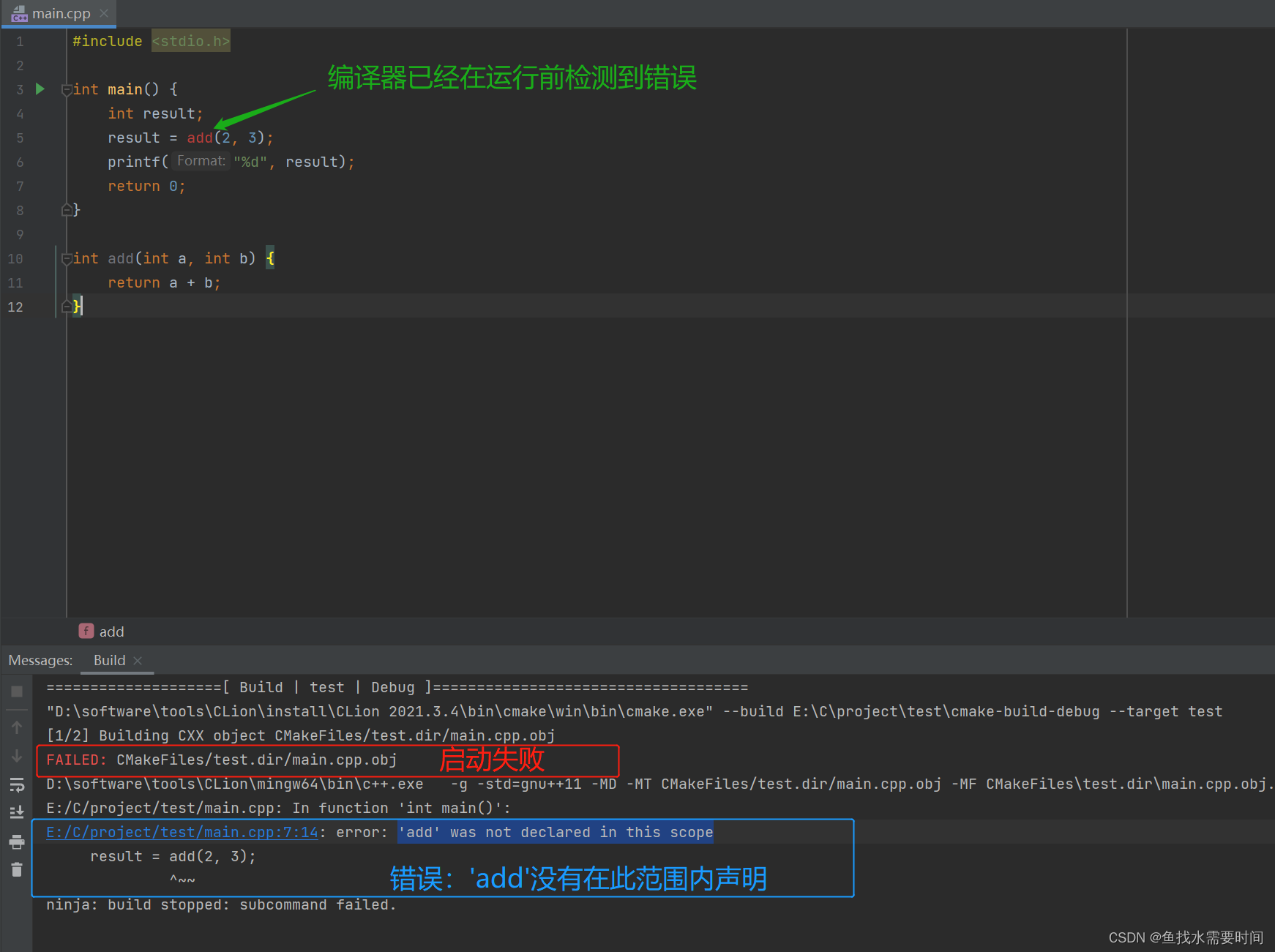 编译器首先看到了一个函数的定义,描述了一个叫 add 的函数。接着,在 main 中需要使用 add ,由于编译器已经知道了 add 的定义,因此编译器可以正常编译通过。(ps:先定义,后使用)