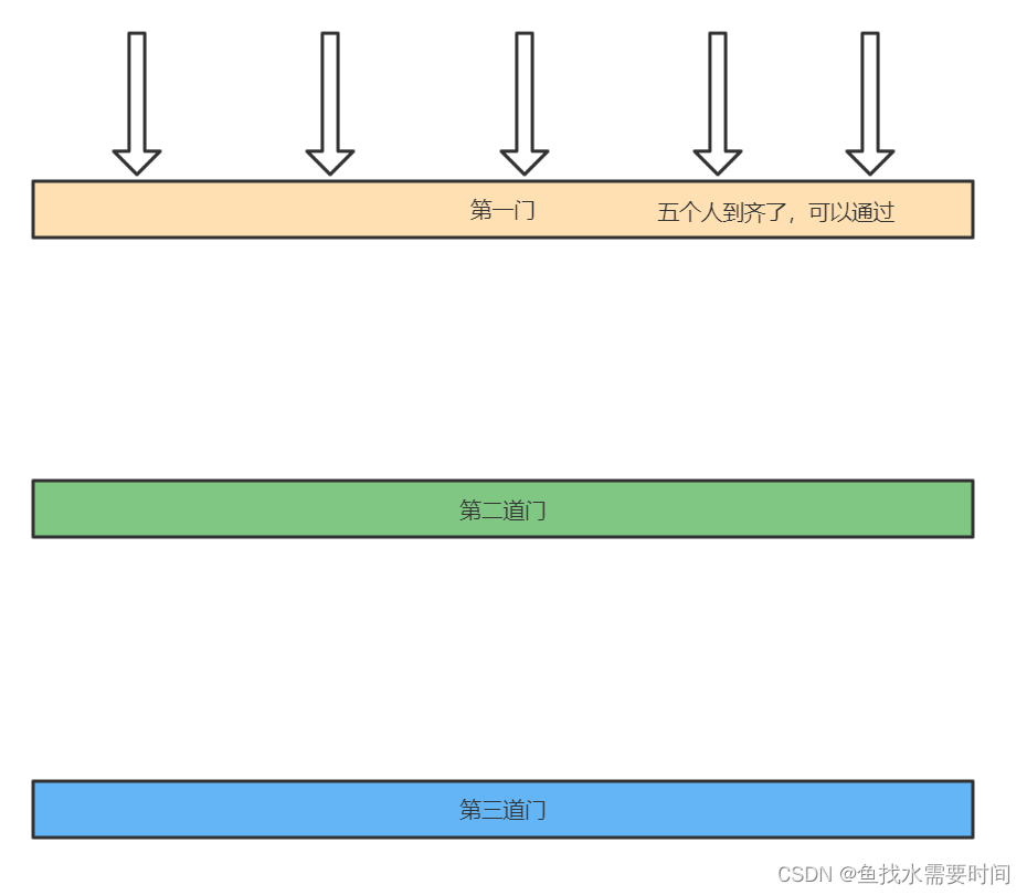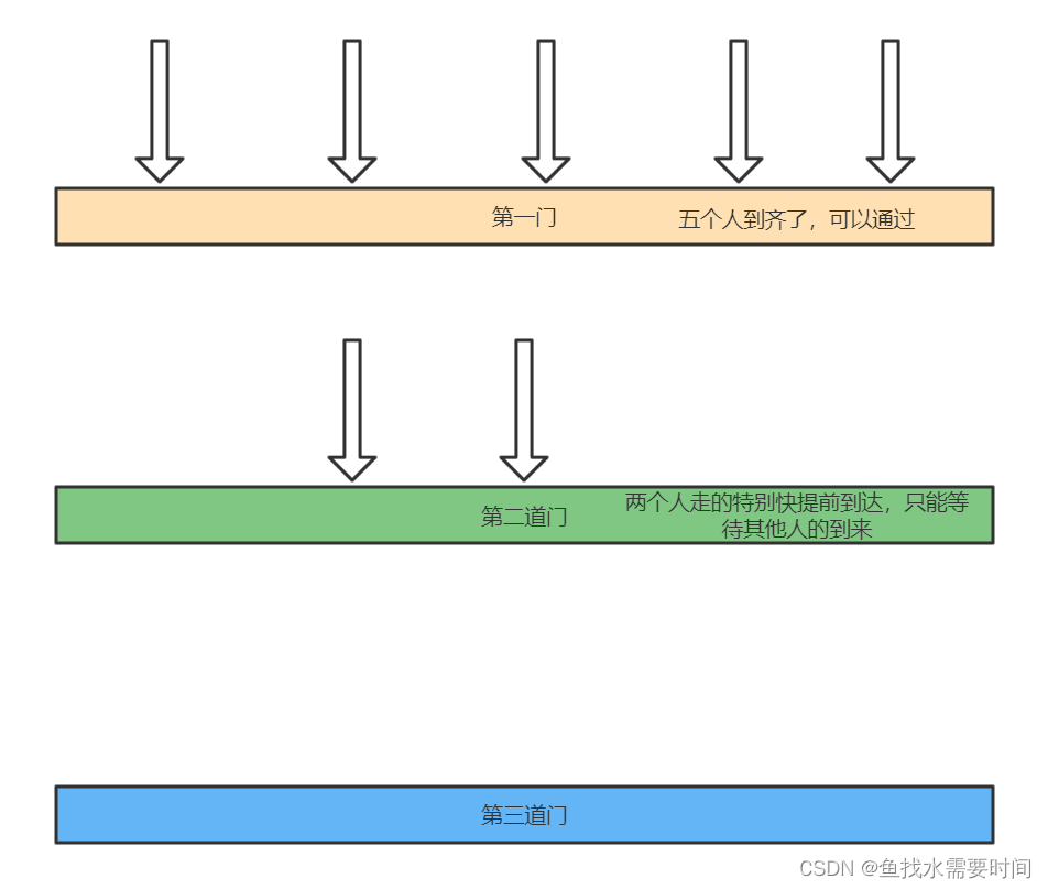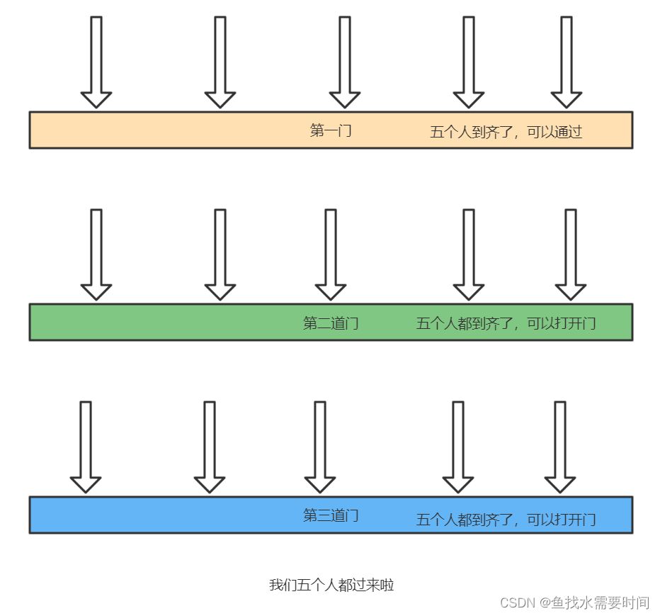 什么意思呢?假如有五个探险者去探险,在他们前方有三道门,每道门都需要五个人同时发力召唤神龙才能打开,如果有一个人走的特别快,它先到达了门前,但是它一个人打不开门,需要五个人同时抵达才能打开门,所以走的快的只能等待最慢的达到,一组五个人到齐之后才能执行打开门这个动作。