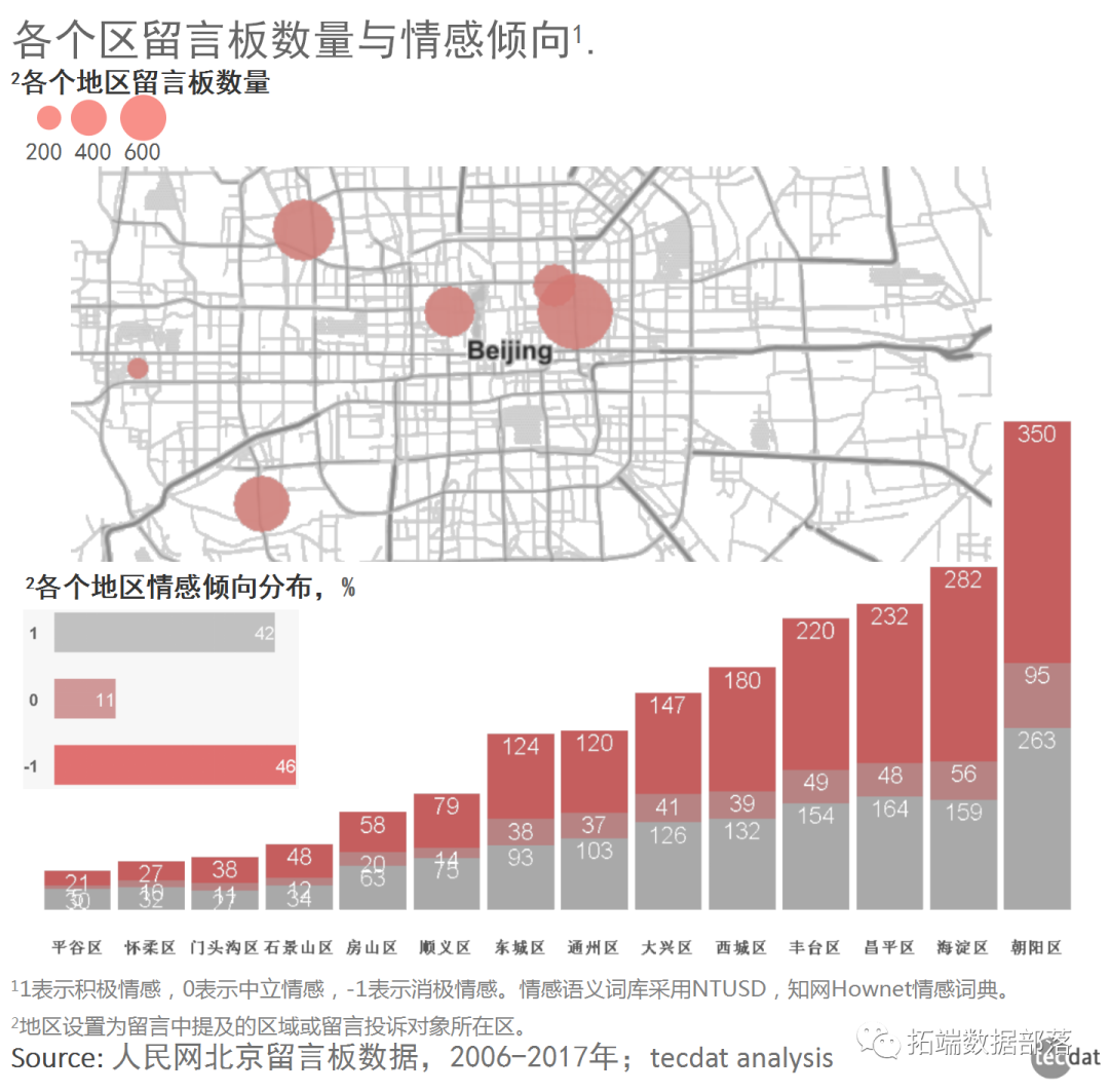 从地区来看,活跃在各大媒体的“朝阳区群众”留言数目也是最多的,其次是海淀区,昌平区。因此,从情感分布来看大部分留言还是在反应存在的问题,而不是一味赞美或者灌水。