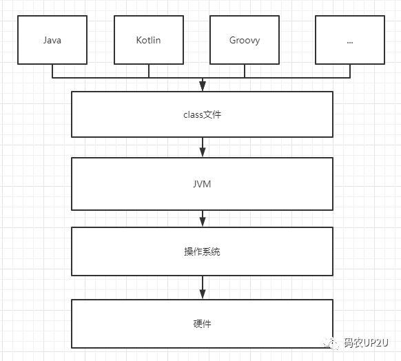 又因为 JVM 是标准,我们可以理解为它对 .class 文件进行了标准化,那么无论是什么语言,只要编译后的能生成符合 JVM 标准的 .class 文件,就可以运行在 JVM 之上。因此,有人说 Java 是跨平台语言,而 JVM 是跨语言的平台。如下图: