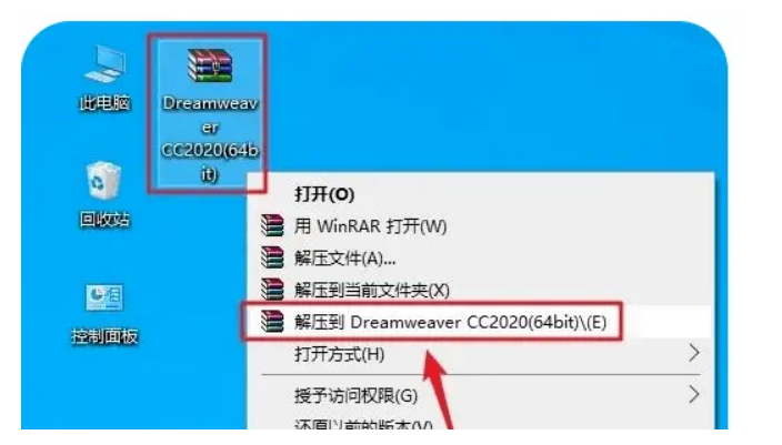 1、右键点击下载好的“Dreamweaver CC2020”压缩包,选择解压到Dreamweaver CC2020。
