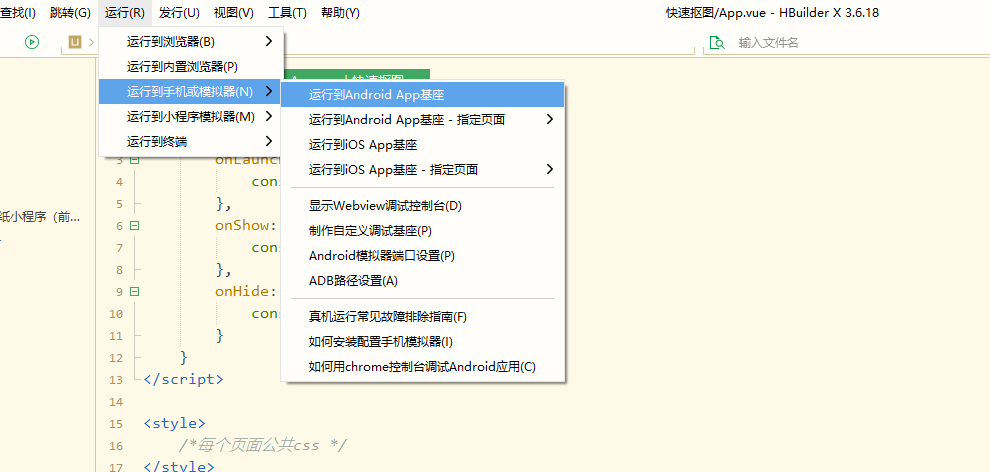然后重启逍遥模拟器,切换到HBuilderX,点击上方的【运行到手机或模拟器】,点击第一个选项【运行到Android APP 基座】,然后检测到后点击运行,项目会开始编译,第一次运行会需要下载几个插件,根据提示安装即好
