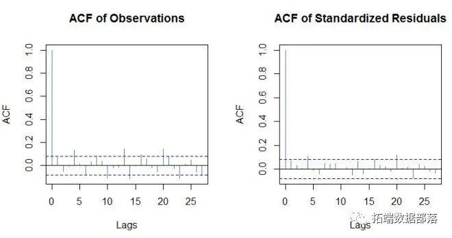 测试对于上面列出的模型,所有残差都具有一些自相关效应。因此,基于GARCH的模型可能不够准确,无法预测波动性。