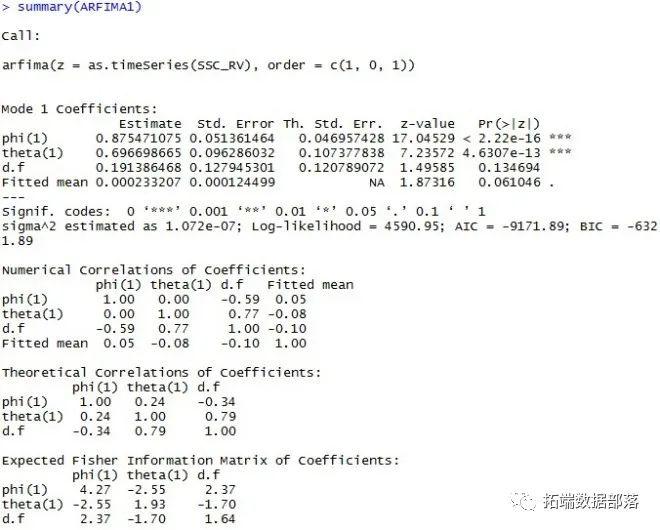 ARFIMA是分整自回归移动平均模型,其具有与ARMA模型相同的表示形式,但差分参数d可以是非整数值: