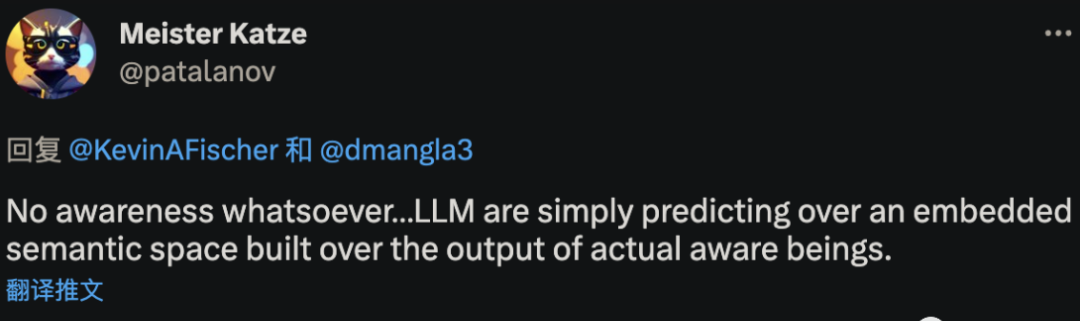 这些LLM并没有产生任何意识。它们只是在预测一个嵌入的语义空间,而这些语义空间是建立在实际有意识的人的输出之上的。