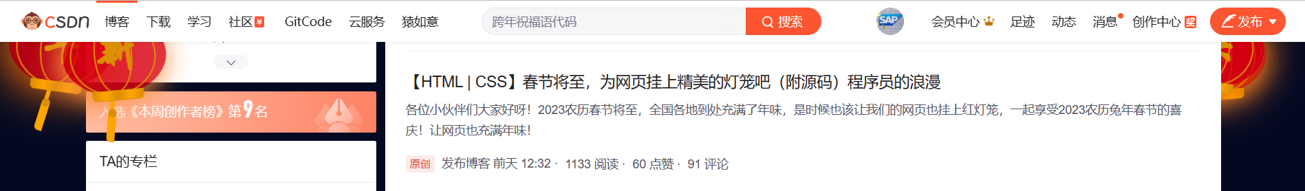 我们介绍了如何为网页添加灯笼元素,让自己的博客或者网页也过上年!一次偶然受到群友的启发:我是不是也能将灯笼元素搬上自己CSDN的博客主页呢?于是便有了下面的尝试。