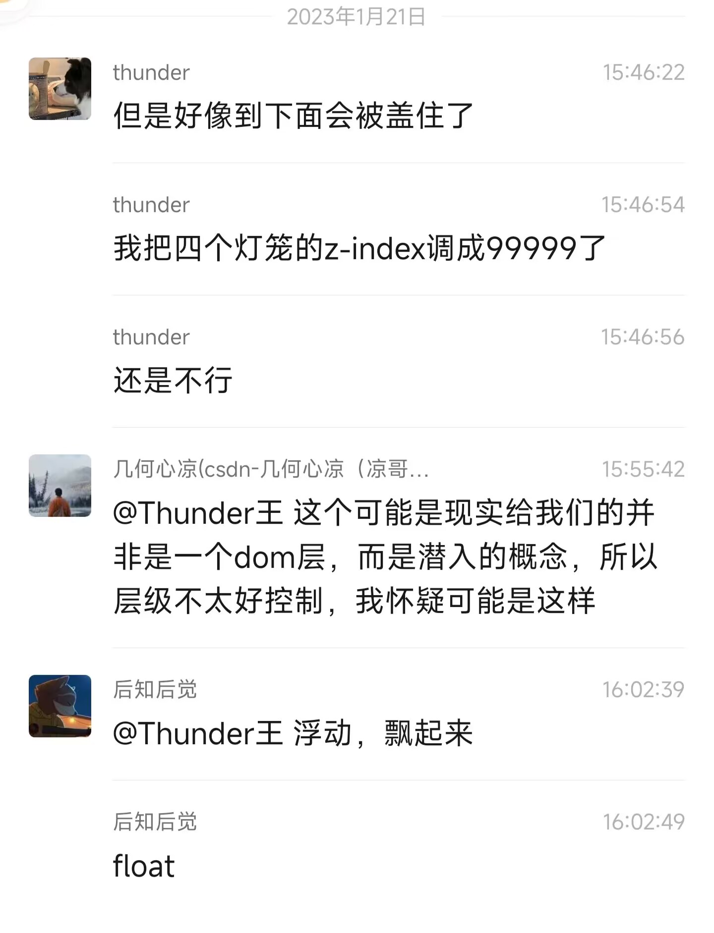 可以看到:灯笼的字体不再被遮挡了,但是右侧两个灯笼始终无法置于最顶层,在摆动过程中还是会被遮挡——这就导致右边两个灯笼很不美观,并且始终只有一个灯笼能够亮相