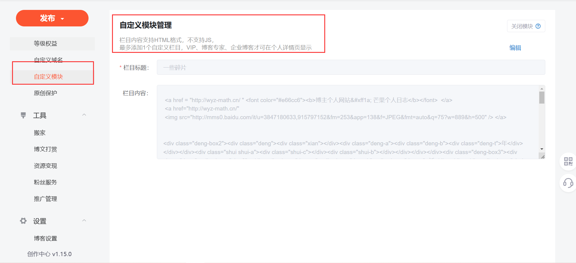 众所周知:CSDN有一个自定义模块,里面可以支持HTML格式的代码,允许开发者们发布一些个性化的栏目介绍