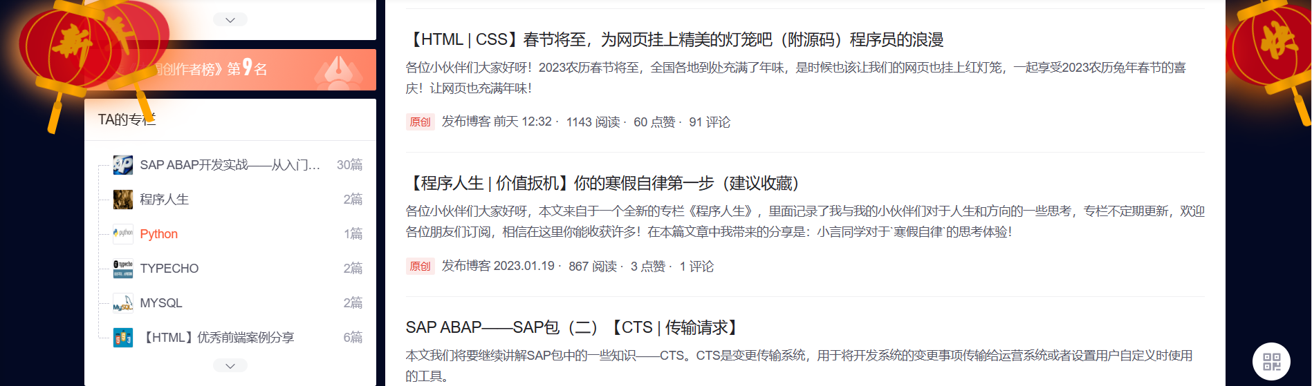 💅文章概要: 各位小伙伴们大家好呀!今天是大年初二,过完了喜庆的大年三十,也结束了忙碌的大年初一,兔年新气象又开始啦!本文续前一篇文章教教大家如何为自己的CSDN主页挂上灯笼!