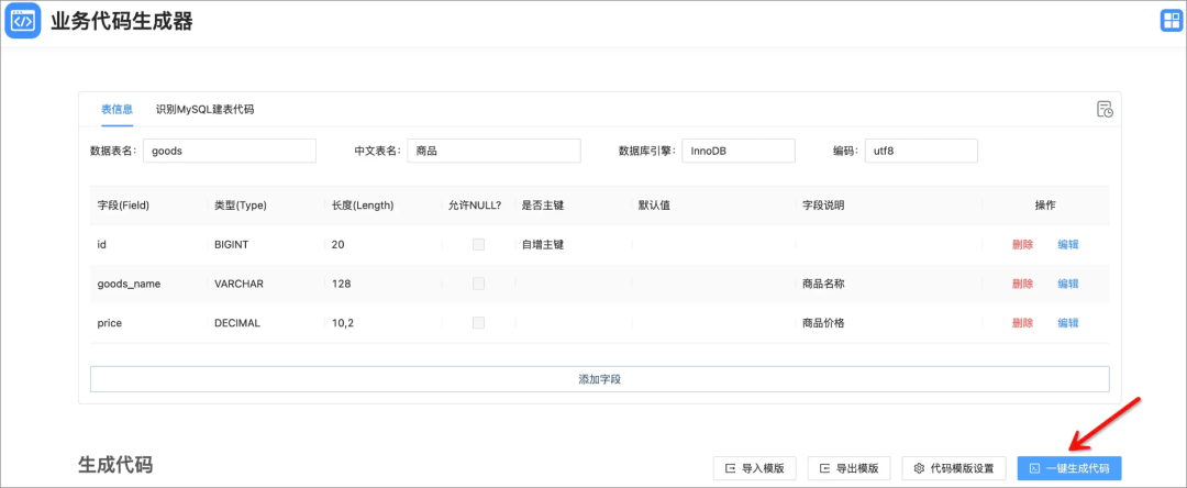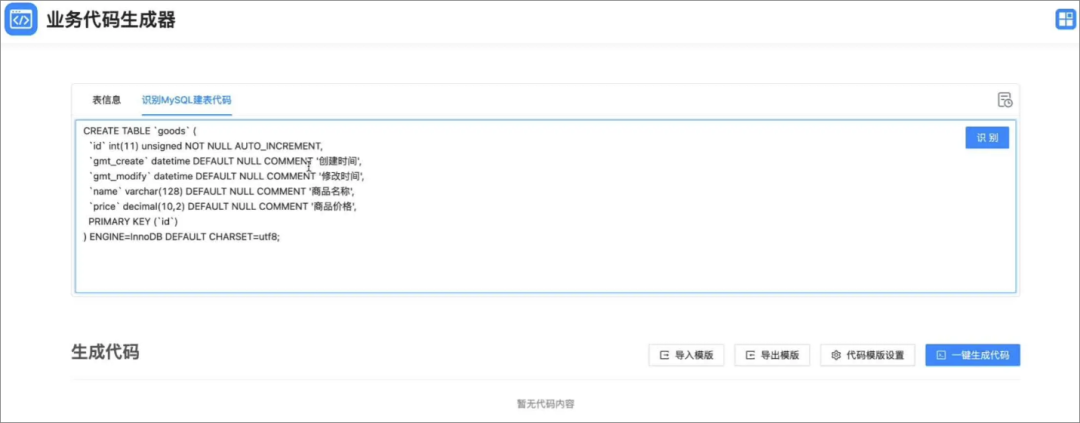 点击“识别”按钮,这个SQL的信息会自动识别过来,这时候只需要把表的中文名称填写上去,点击“一键生成代码”,就可以马上得到这个表的业务代码。