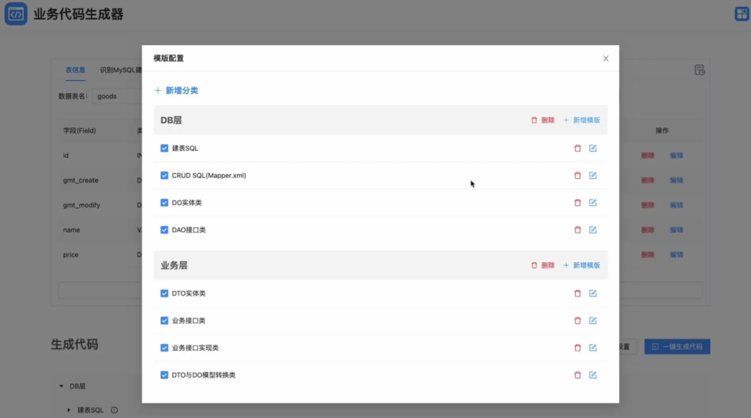 点击“代码模版配置”按钮,在这个弹窗里,我们可以新增、删除代码的分类。同样的,也可以新增、删除和编辑具体的代码模版。