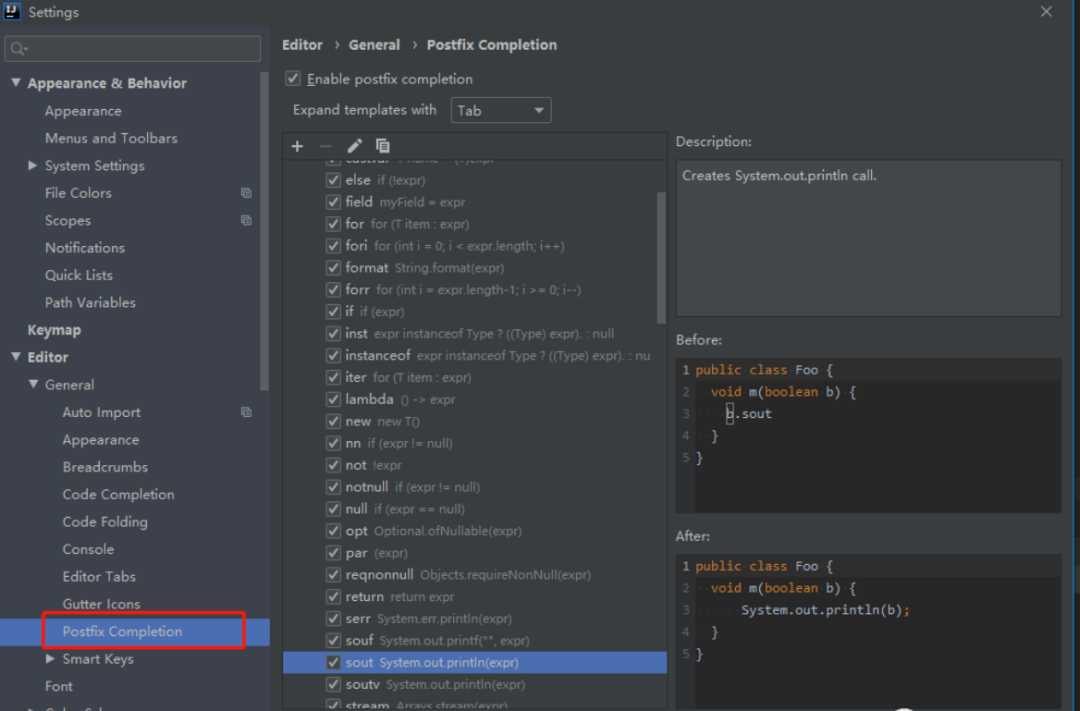 例如 : eclipse 中的syso是打印控制台输出 ,但是idea默认是sout , 如果非要改成syso 可以在Postfix Completion里面设置,类似的 fori等都是在里面设置