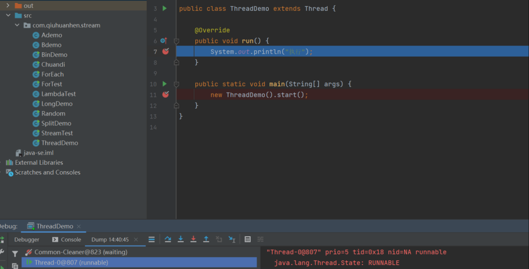 当我们把run方法改成start()方法时,可以看到是线程thread0执行的。