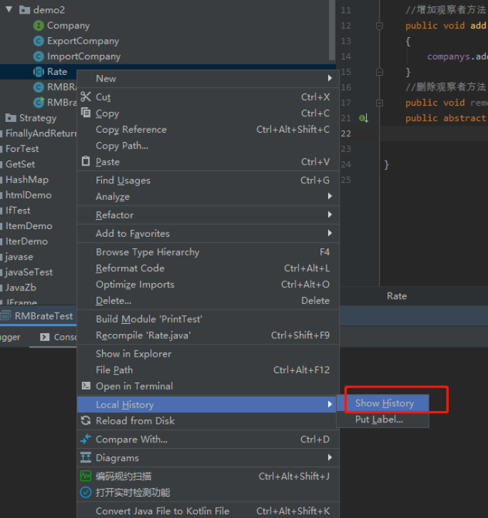 鼠标在需要查看的java类 右键 找到Local History >> Show History 点开即可看到历史版本,常用于自己忘记代码改了哪些内容 或需要恢复至某个版本 (注意 只能看近期修改 太久了也是看不到的)