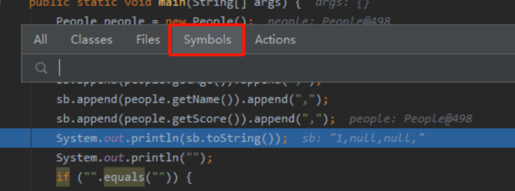 例如People类里面的test方法,按ctrl+shift+alt+n 输入Peo.te 就可以查到该方法了,如果觉得这个快捷键难记 也可以按ctrl+shift+r (查找某个文件名的快捷键 下图中的Files),再手动选择Symbols