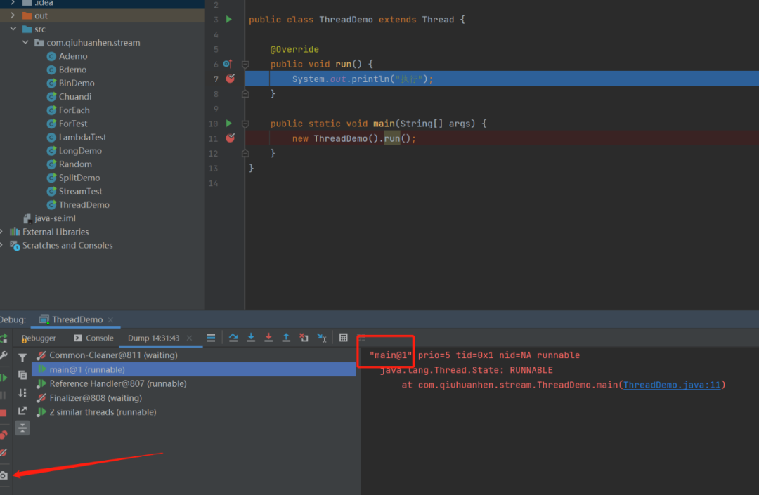 在断点调试的时候,我们可以通过点击下图红色箭头指向的相机图标,获取当前线程的dump信息。