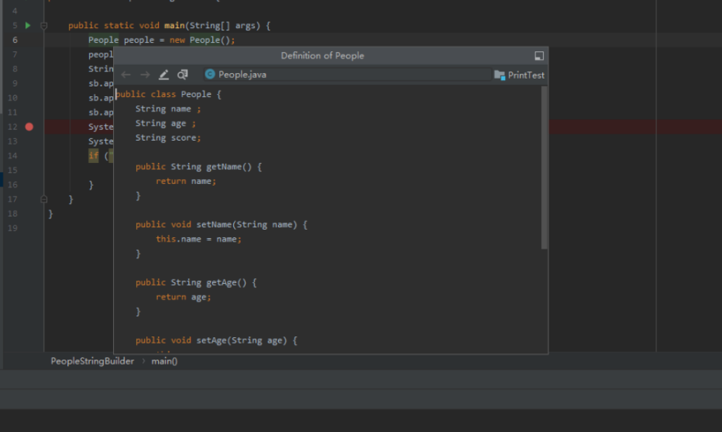 例如我们在test类中,有句代码:People p = new People(); 我们想稍微查看一下People这个类,但是tab已经够多了,ctrl+alt+b会打开新的标签,标签多了就混乱了,尤其一堆命名类似的tab,这时候我们可以按ctrl+shift+i 实现预览功能,不占tab