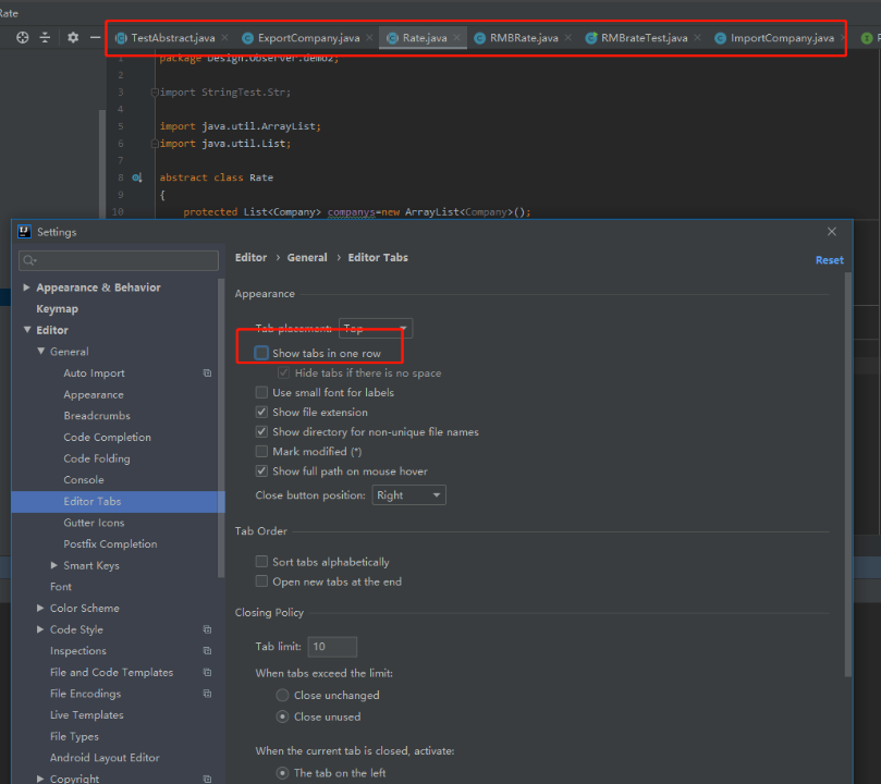 idea默认是选择显示单行的,我们把这个去掉,就可以显示多行tab了,在打开tab过多时的场景非常方便!