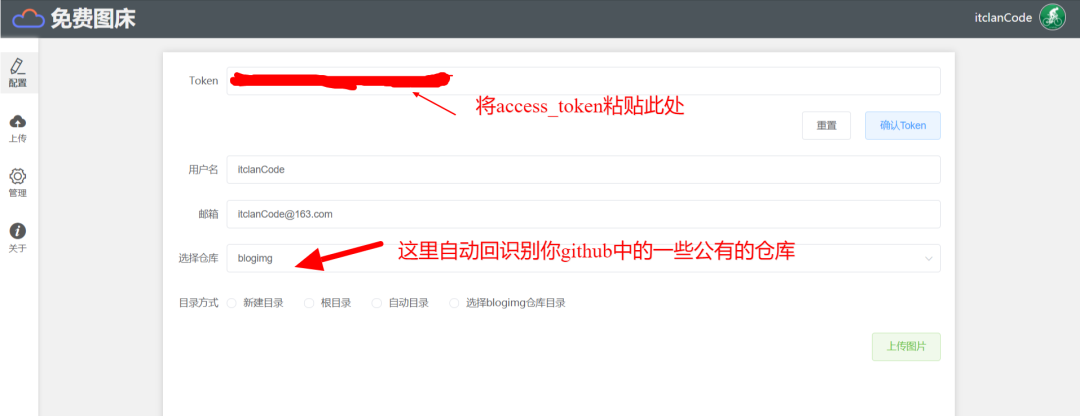 绑定 GitHub Token、存储图片的仓库和目录方式。