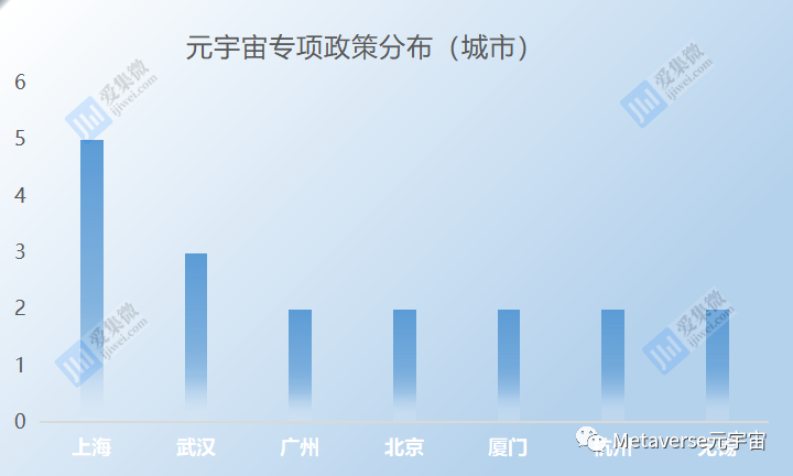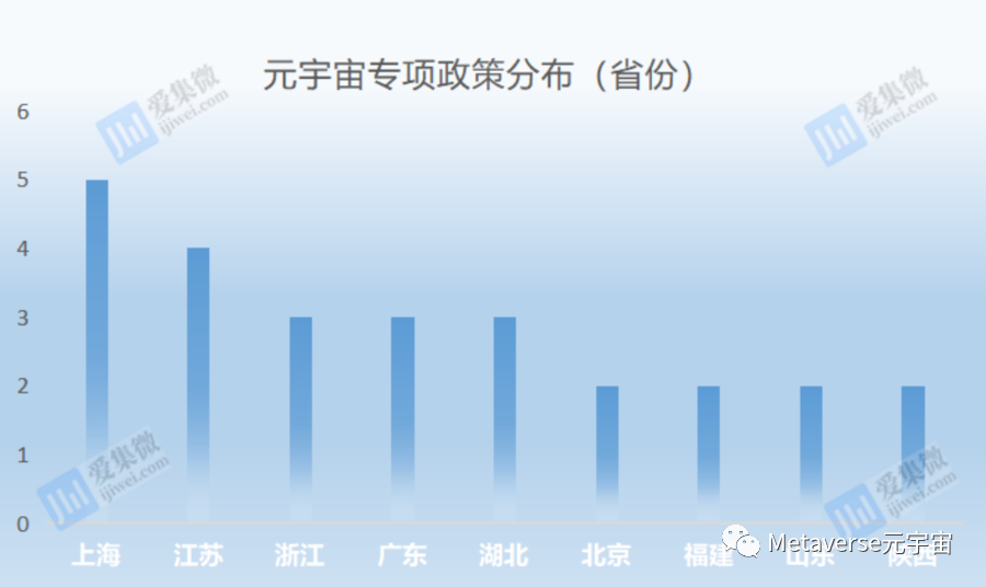 从区域分布来看,32条元宇宙专项政策中近40%分布于长三角地区,以上海、江苏、浙江为主,其中单项补贴最高达5000万元;从省份分布来看,上海、江苏、浙江、广东、湖北元宇宙专项政策皆超3项;从城市分布来看,上海、武汉、广州、北京、厦门、杭州等多个市辖区聚力发展元宇宙产业。