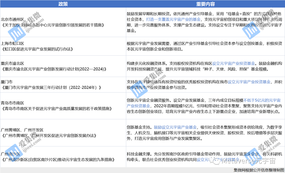 此外,2022年5月,广州天河区元宇宙联合投资基金正式发布,总规模逾200亿元;同年9月,江苏昆山设立元宇宙产业投资子基金,总规模10亿元等。
