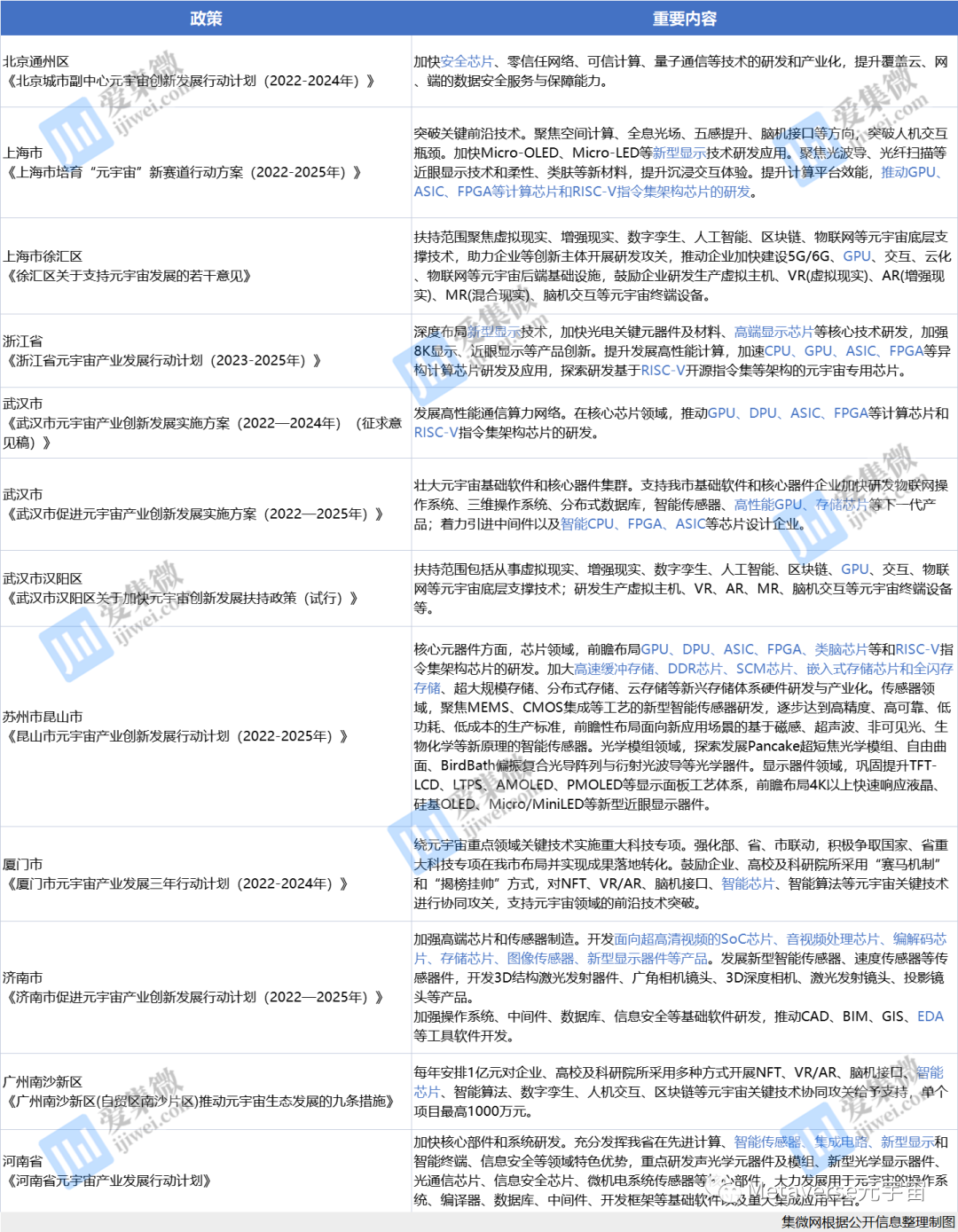 32条元宇宙专项政策中,超12条政策涉及集成电路领域,占比近40%。上海、浙江、武汉等发布的元宇宙政策,更是将GPU、ASIC、FPGA、RISC-V同时划为重点。