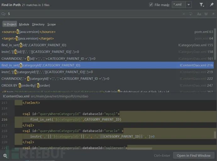 根据文件名带Dao的xml为我们需要的,以IContentDao.xml为例,双击打开,ctrl +F 搜索$,查找到16个前三个为数据库选择,跳过,