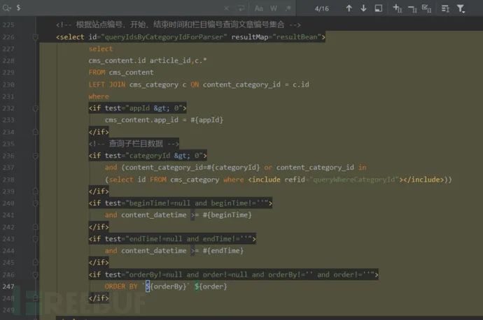 2、xml方式编写sql时,可以先筛选xml文件搜索$,逐个分析,要特别注意mybatis-generator的order by注入
