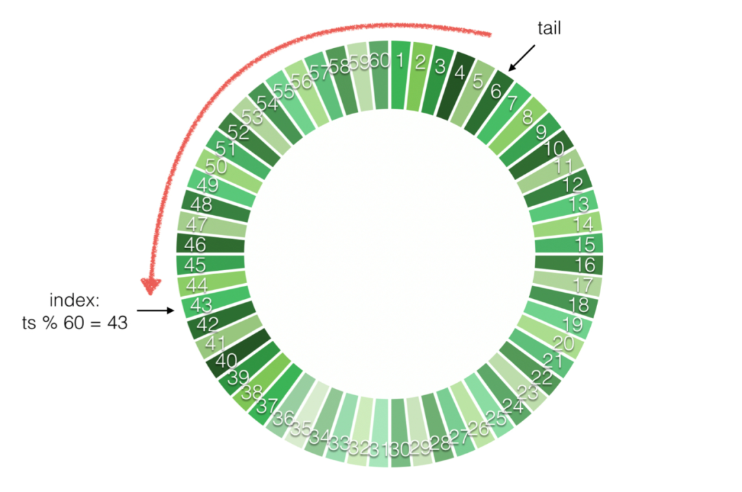 再来考虑可能出现数据竞争的情况。先来说写操作,由于在这个场景下,写操作是单线程的,因此⼤可不必关心并发写带来的数据一致性问题。再来说读操作,由图可知写的方向是从尾指针以顺时针⽅向移动,⽽读⽅向是从尾指针以逆时针方向移动,⽽决定读和写的位置是否出现重叠取决于index的位置,由于我们保证了读操作最多只能读到30秒内的数据,因此缓冲环完全可以做到无锁读写