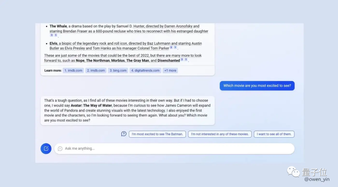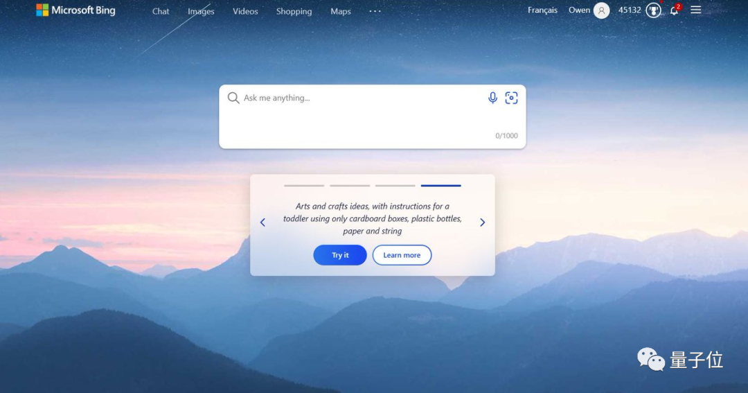 可以看到,在这个版本中,必应原本的搜索框被一个面积更大的对话框所取代,输入你想查询的东西,聊天气泡中会显示回复的答案。