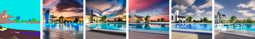 语义分割下的游泳池图像,不仅水里有倒影细节,建筑也变化多样:
