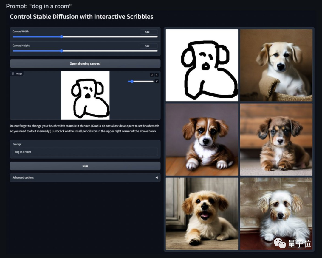 加个抽象到爆的草图buff,AI变着风格生成“完全一致”的狗子: