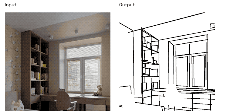 当然,ControlNet还可以实现其它诸多的功能,例如在装修设计上,可以输入一张拍好的卧室图,分分钟输出草图和换了风格的效果图: