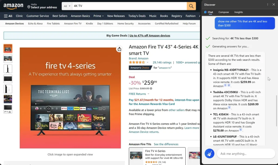 你可以想象未来 Word 或 Outlook 有类似的集成来让你创建文档或电子邮件。从技术上讲,现在只需在这个新的 Edge 边栏旁加载基于 Web 的 Word 版本,就可以做到这一点。