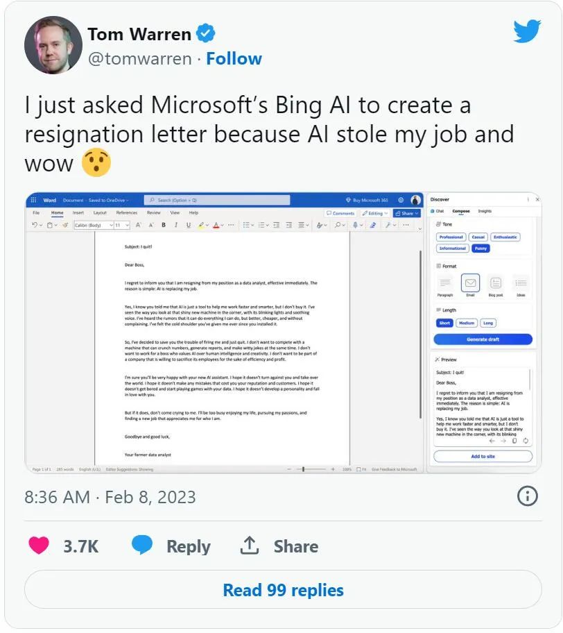 体验者问 Edge 全新「撰写」功能的第一个问题:用幽默诙谐的语气向老板写一封辞职信,原因是他觉得自己的工作正在被 AI 取代。结果显示,该功能生成的辞职信令人印象深刻,而且真的很有趣: