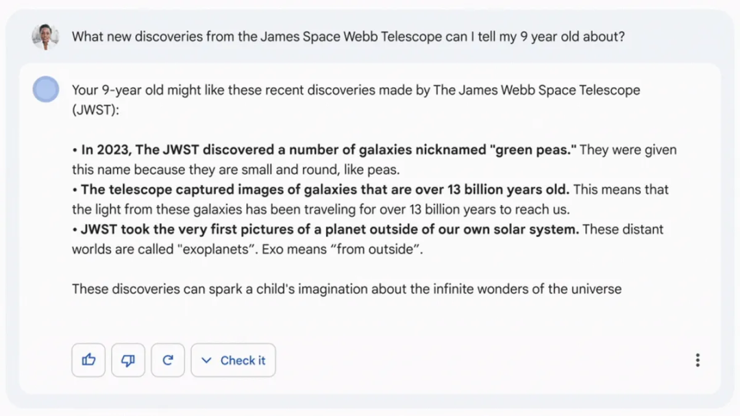谷歌 Demo 的一 GIF 显示,在回答问题「关于詹姆斯韦伯太空望远镜(JWST)有哪些新发现,我可以告诉我 9 岁孩子哪些内容?」Bard 提供了三个要点,其中一个指出「该望远镜拍摄了太阳系外行星的第一张照片。」