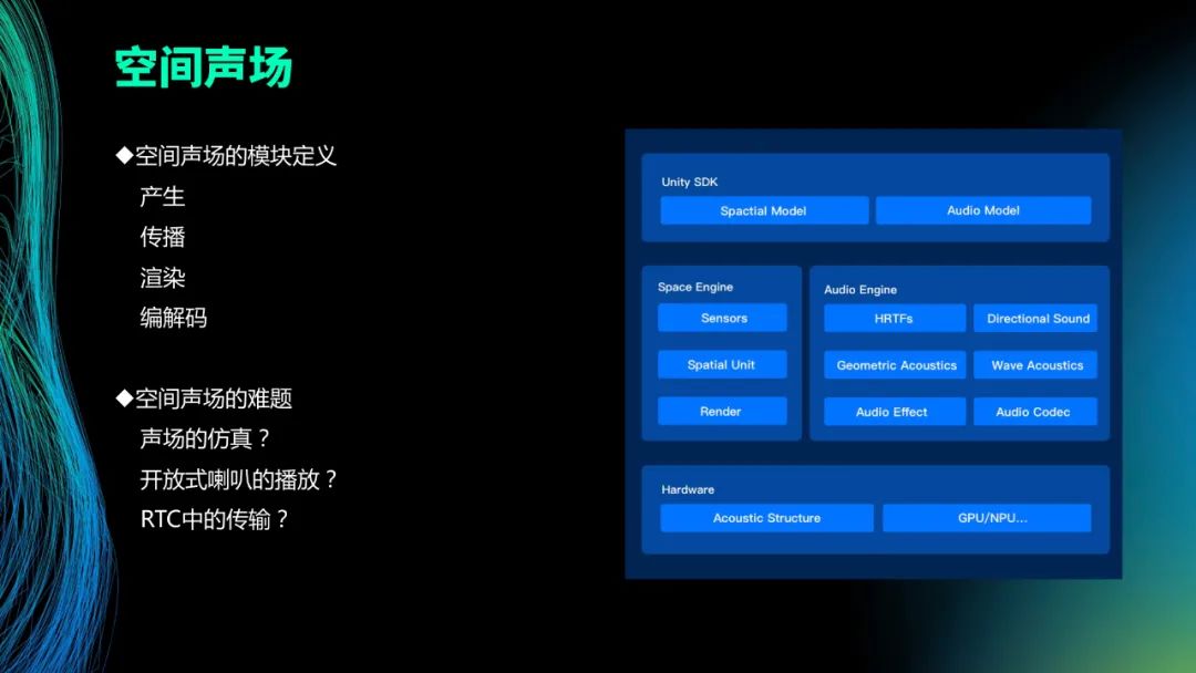 我们自己定义空间声场是从产生再到传播,整个传播过程中因为在AR、VR里都会出现,声音出来之后,大家很多利用头传或者是其它方式模拟球体范围内声音的产生,然后再到球体范围之外的声音该以平面波,还是以一维的波动方程,还是该以三维的波动方程去模拟、仿真的时候,每个人需要根据自己的算力去平衡去简化的,同时需要考虑传播过程中涉及到的一些障碍物。我戴着AR眼镜确实走到了另一个地方被一堵墙隔了声音,要不要遮挡,怎么去遮挡?包括经过那些东西的反射吸收了多少,还剩多少。这些都是去考虑的问题,再到编解码的模块定义外面的一些全景声能不能导到你这里进行播放。这是对于模块的一些定义。