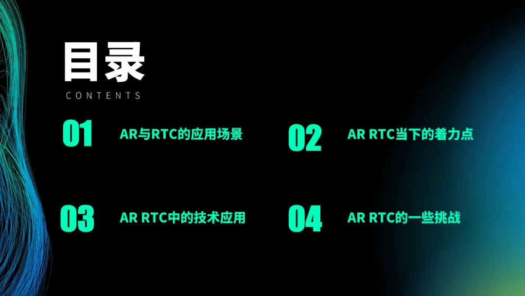 下面,我从以下四个方面给大家介绍一下AR里面我们做的RTC的技术应用点。