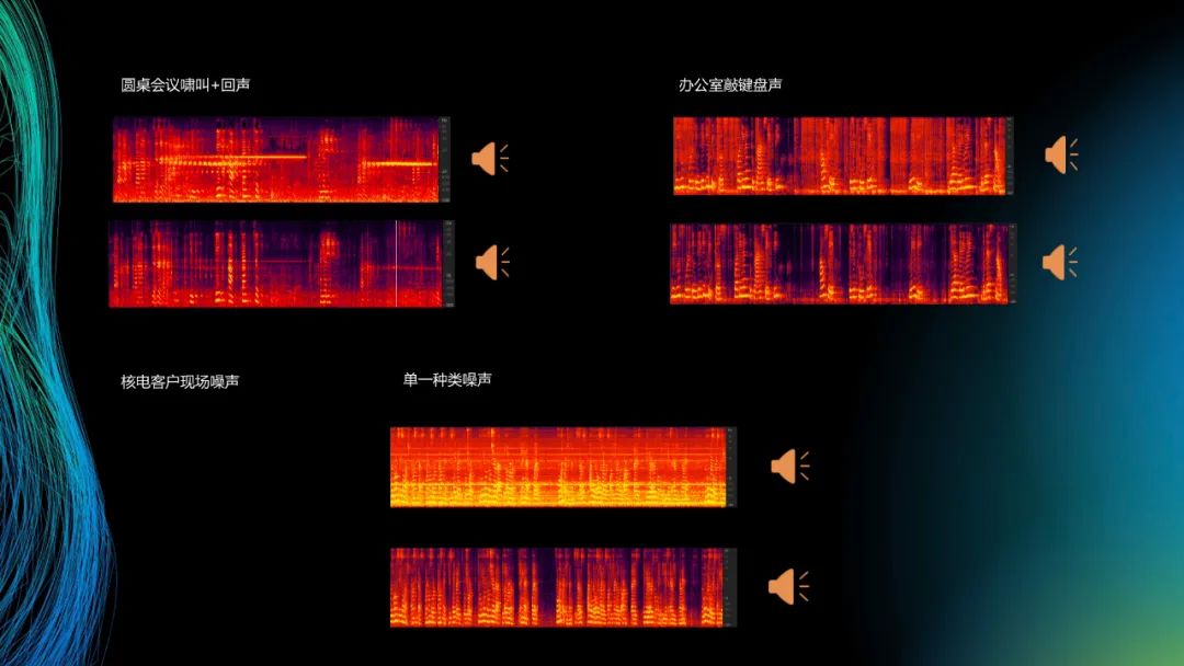 圆桌会议是真实的应用场景。我们用客户的SDK,但是客户的SDK在一些场景下啸叫跟回声解决不掉,那些垂直黄线其实就是噪声,然后我们把自己的降噪用进去,就可以一定程度上消除掉啸叫。另外一个就是核电客户现场的噪声,本身声音是有点吵的,整个平台都是客户现场机器噪声,听不到语音内容的;最后就是很普通的办公室的这里面的声音。