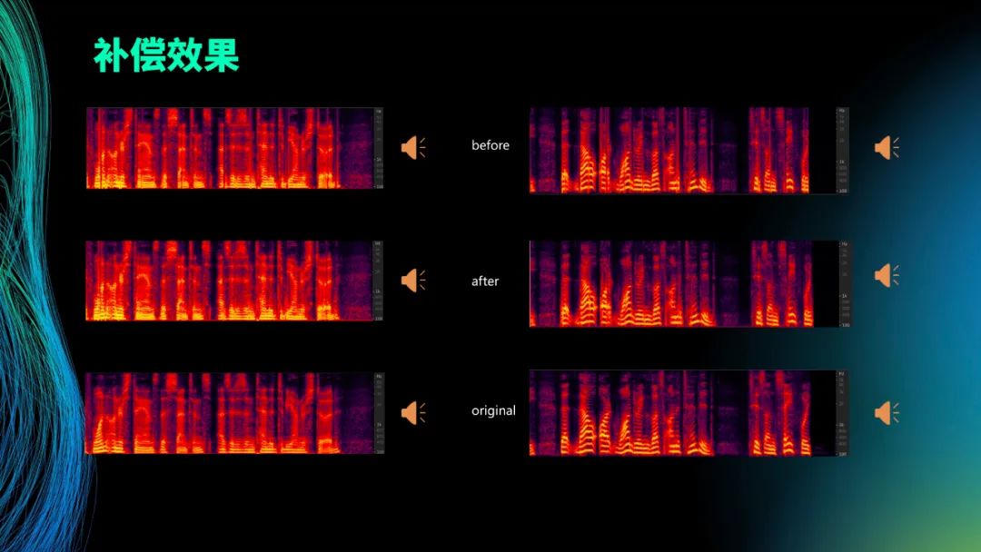 开放式的喇叭在弱网下本身听起来就会比较吃紧不清楚,如果再发生丢帧的话效果就会更差,所以我们针对这一点专门做了音频的补偿。当然,音频的补偿其实本身的历史也是从LPC技术切换到深度学习的方式做。Web RTC其实也改成用深度学习的方式,大家很多都在用GAN的方式去进行丢包生成。我们本身的操作就是模拟丢包率在10%到30%之间,整个丢包时长最长的大概是120毫米之内,然后验证PESQ的效果。这个基于的是在DNS挑战赛的模型上做优化。