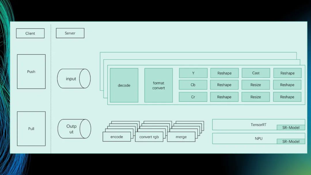 除了框架之外,我们会同时把CPU跟GPU放一起,因为我们的设备上有NPU加速,把这几个流水线跑起来。其实一次性把很多东西放在GPU上去做,然后有一些东西在服务端可以直接走TensorRT的处理,在我们端上的话就直接走NPU的。我们会根据算法和硬件的性能去设计、调优这个pipeline,我们把很多能在NPU上操作的全部移到4核NPU上,包括利用图片的解码,以及解码的数据直接放在CPU上放着。NPU直接去获取,减少CPU跟区间的通信,同时把CPU的资源利用起来做一些并行处理。