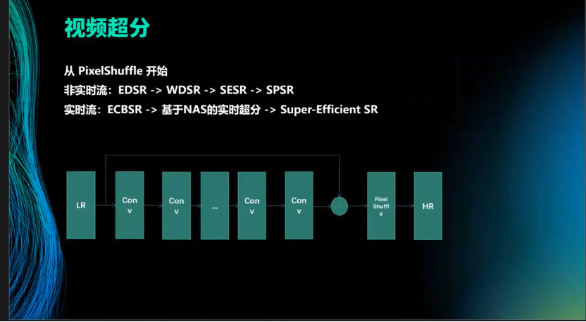 超分是针对AR头环端收到的一些数据,数据本身视频分辨率只有360P,在山区等弱网下收到RTC的数据后,我们会再做实时的超分。超分本身这件事就是从深度学习PixelShuffle后的时候开始,基本上网络结构就是呈现到一个从低分辨率的LR再到HR的过程。Shuffle本身是视频超分的一个恢复操作,非时流的经历过一些发展路线,大家都是换中间的一些骨架,包括ResBlock、SEBlock等,再到提出实时流的框架ECBSR,大家会基于NAS做实时检索,自己做搜索找一个更达到目标的东西,别人再从参数化去做。我们自己也是基于这个大的框架,只不过本身卷积Block就会根据端上的性能做一些裁剪使得它在端上能够做到实时。